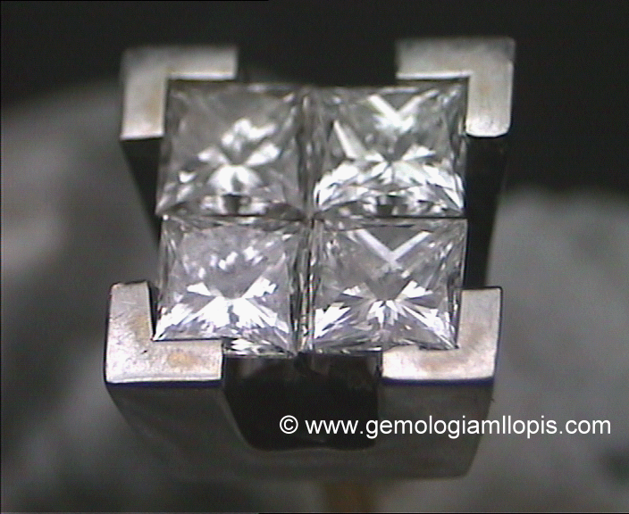 Sortija «solitario» con una montura cuadrada de cuatro garras planas en ángulo de 90º que engastan aparentemente un gran diamante de talla «princesa» cuadrada. En realidad son cuatro pequeños diamantes de talla princesa cuadrada engastados con engaste invisible y las cuatro garras que vemos formando una sola montura.