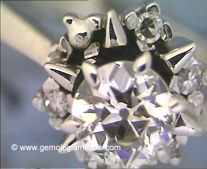 En este solitario con un diamante de talla brillante antigua, y una orla en un plano inferior, de pequeñas monturas de cuatro garras que engastan diamantes de talla 8/8. Sin embargo, quiero entender que les faltaría una piedra, o por falta de tiempo de buscarla, o ¡no se que! el joyero soldó una bolita de oro para suplir la falta de esta piedra.