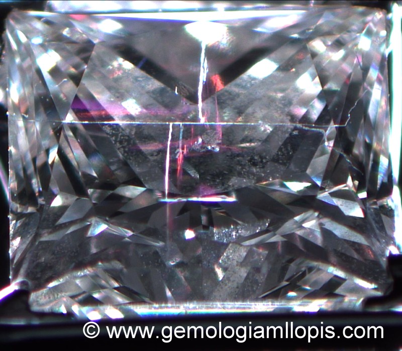 Diamante de talla princesa que ha sido tratado con relleno de vidrio para sellar sus fisuras y conseguir mejor transparencia.