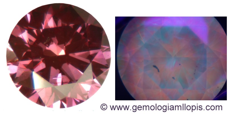 El color de este diamante no es natural, se ha conseguido por un tratamiento HPHT. Su fluorescencia rojiza e irregular es un indicador del tratamiento.