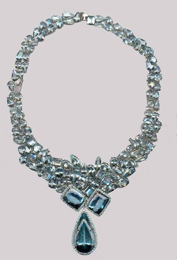 En nuestro laboratorio hemos tenido el placer de poder estudiar este espléndido collar de aguamarinas naturales. La piedra central de talla pera pesa 89 quilates. Hemos podido comprobar su peso porque la hemos desmontado. Las dos piedras que le siguen en tamaño, por su disposición , nos ha permitido colocar la tabla en un refractómetro y leer su índice de refracción, con lo que podemos demostrar que son aguamarinas. En el resto de piedras hemos desmontado al azar algunas de ellas en diferentes tallas para comprobar su índice de refracción y su peso.
