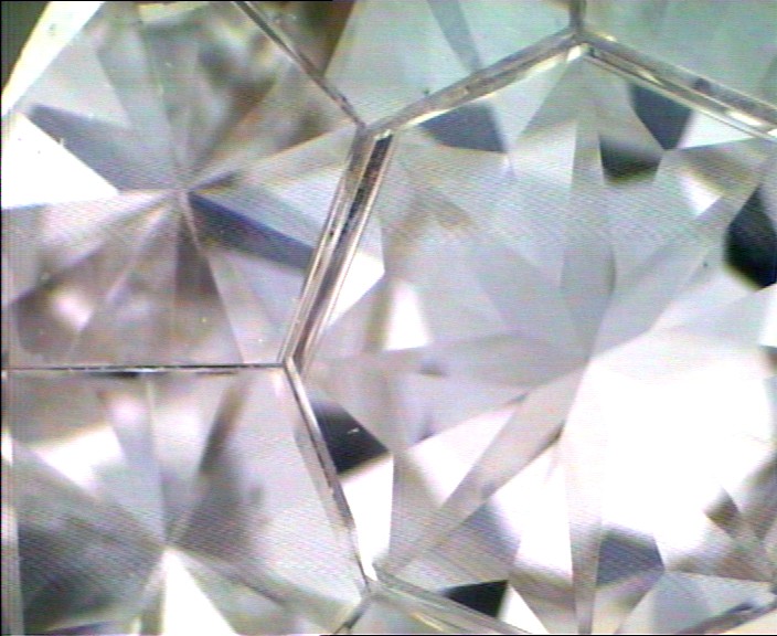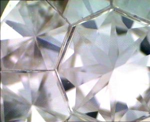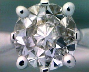 Cuando vemos las piedras, siempre es una costumbre cuando un cliente deja en depósito unas piezas, antes de firmar el recibo de depósito, observar si de verdad se trata de diamantes, de si no falta ninguna piedra, etc. y nuestra sorpresa es que lo que parece un diamante, en realidad son nueve diamantes perfectamente unidos, con una simetría perfecta, engastados con el apoyo de las garras, pero la unión entre sí es mediante la técnica del engastado invisible, de tal manera que a la vista parece solo una piedra, que es lo que el joyero dice que le ha vendido. En realidad se trata de un trampantojo, un engaño a la vista. El joyero no andaba desencaminado en cuanto al peso de la piedra por su diámetro, que sí se corresponde con el de un diamante de talla brillante, pero no se corresponde con el peso de la suma de las 9 piedras que es muy inferior, además de que no valen lo mismo una piedra de 0,70 quilates , que nueve piedras cuyo peso total es de 0,70 quilates.