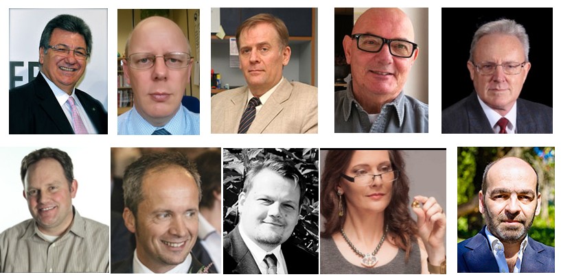 Ponentes del II Congreso de Gemología y Joyería del Mediterráneo, de izquierda a derecha: Gaetano Cavalieri, David Fisher, Dusan Simic, Jean Claude Michelou, Jeffery Bergman, Sonny Pope, Alan Hart, Mikko Åström, Lisa Elser, Rui Galopim de Carvalho.